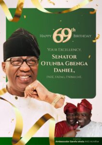 In a message personally signed by him “Senator Otunba Gbenga Daniel: The Life of Service and Leadership – Birthday Tribute,” Ambassador Isola said “It is with immense joy and profound respect that I extend my heartfelt congratulations to you on the occasion of your 69th birthday. As the Senator representing Ogun East Senatorial District and the distinguished Chairman of the Senate Committee on Navy, your leadership has been an inspiring force in shaping not just the political landscape of Ogun State but the entire nation. Your unwavering commitment to service has paved the way for countless achievements, and today, we celebrate your remarkable career in governance.