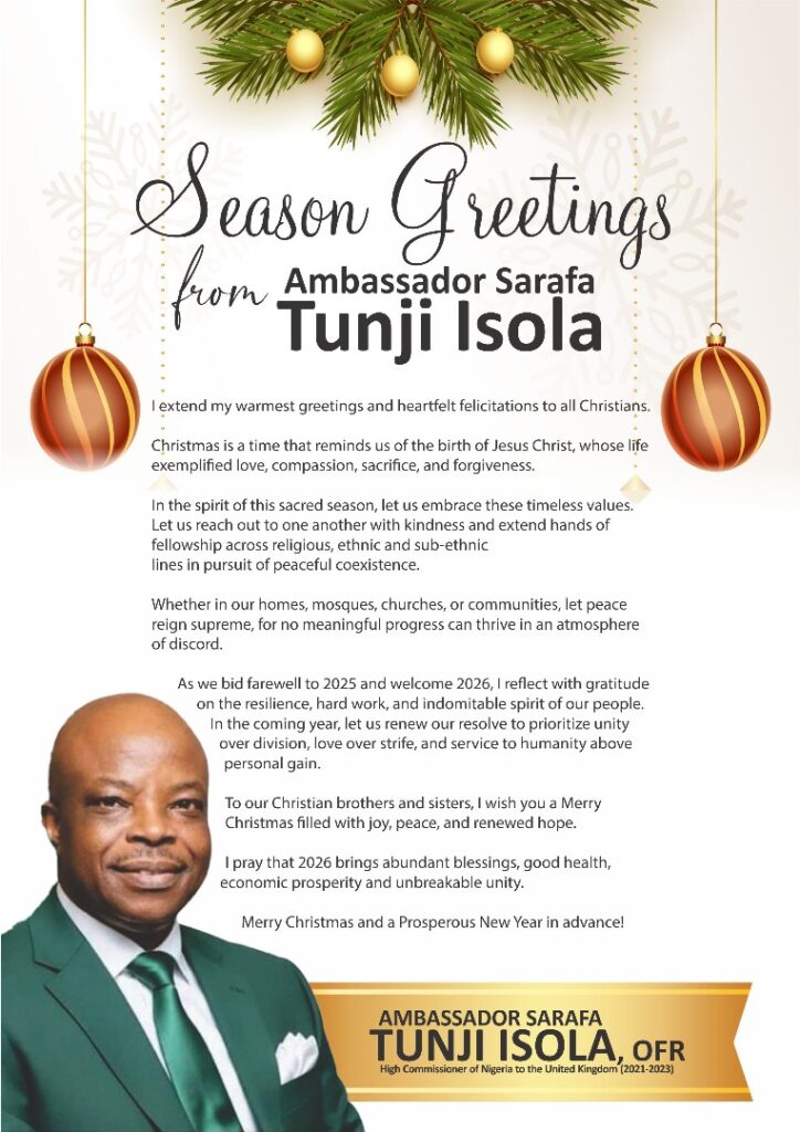 Ambassador Sarafa Tunji Isola has sent Season Greetings to Christians on the occasion of this year’s Christmas and New Year festivities.
