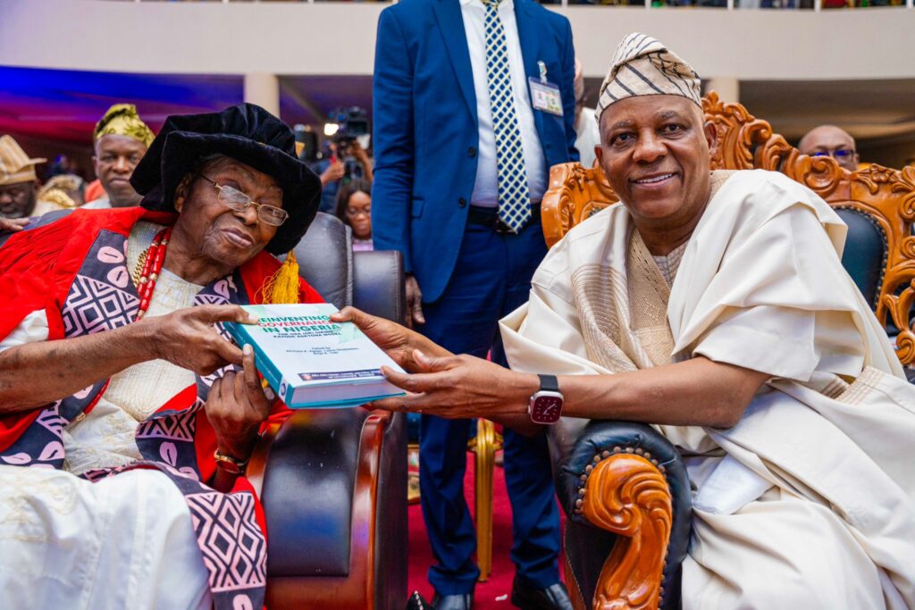 - R-L: VP Kashim Shetima and Oba Adetona at the commissioning of the Oba Sikiru Kayode Adetona School of Governance Studies and the presentation of a book titled; “Reinventing Governance in Nigeria: The Oba (Dr.) Sikiru Kayode Adetona Model” at the Olabisi Onabanjo University, Ago-Iwoye , Ogun State on Friday *