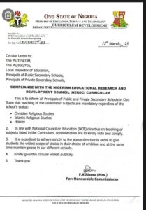 In the circular titled “COMPLIANCE WITH THE NIGERIAN EDUCATION RESEARCH AND DEVELOPMENT COUNCIL (NERDC) CURRICULUM “, the state government said “This is to inform all Principals of Public and Private secondary schools in Oyo State that the teaching of the underlisted subjects are mandatory regardless of the school’s status: