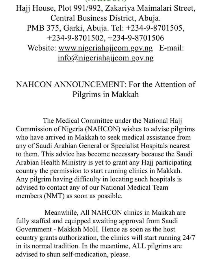 The National Hajj Commission of Nigeria (NAHCON) has asked Nigerian pilgrims in Makkah who need medical attention to visit any nearby Saudi Arabian hospital until approval is granted clinics belonging to its Medical Mission to commence operation.
