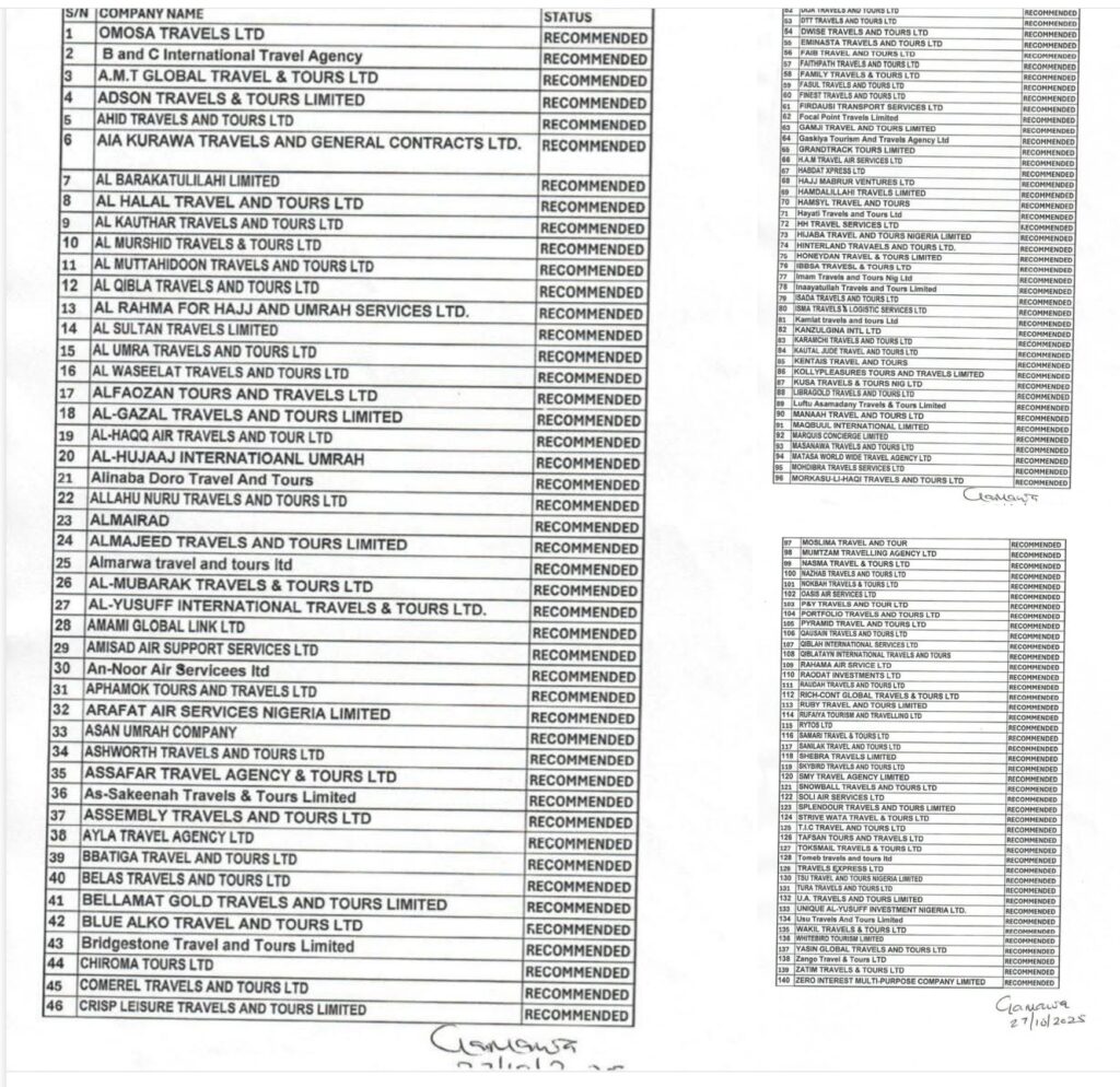 The Tour Operators’ Division under the National Hajj Commission of Nigeria (NAHCON) has released the list of 140 successful Tour Operators approved to conduct the 2026 Hajj and Umrah.