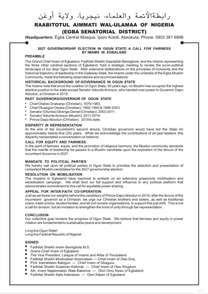 The request is contained in a statement titled 2027 GOVERNORSHIP ELECTION IN OGUN STATE: A CALL FOR FAIRNESS BY IMAMS IN EGBALAND.