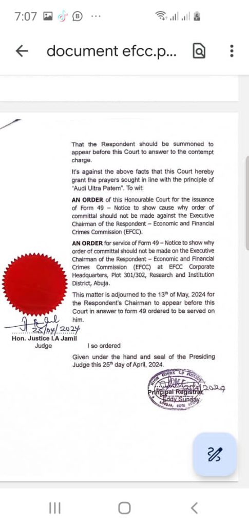 Justice I. A. Jamil, delivering a ruling in Suit No: HCL/68M/2024 and Motion No: HCL/190M/2024, ordered that “the said act was carried out by the Respondent (EFCC) in violation of the order, which was valid and subsisting when they carried out the act. That same act of the Respondent amounts to Contempt.